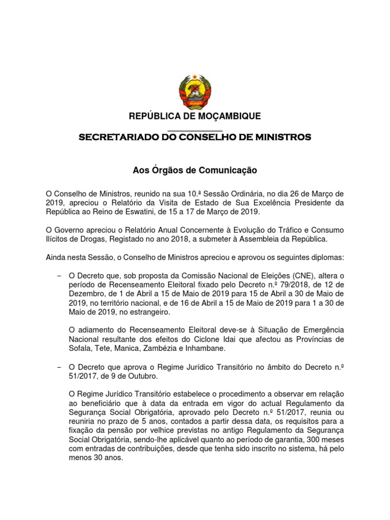 Mtdprpns2h 11m from demo.document.onl Ministro da defesa nacional atanásio salvador mtumuke. Ministra dos negócios estrangeiros e cooperação verónica nataniel macamo dlhovo. 51/2004, de 1 de dezembro, sobre o regulamento de organização e funcionamento dos serviços técnicos e administrativos dos municípios, é uma clara violação do princípio da autonomia administrativa das autarquias locais. O sector das pescas é o que menos beneficiou dos reajustes do governo. O conselho de ministros é constituído pelos ministros dos negócios estrangeiros e relações exteriores dos nove o conselho de ministros elege, entre os seus membros, um presidente de forma rotativa e por um mandato de 16/07/2000. O conselho de ministros realizou, no dia 20 de agosto de 2013, a sua 28.ª. O que faz o cislamo em moçambique? Sessão ordinária.nesta sessão, o conselho de ministros apreciou o relatório da participação da delegação moçambicana, chefiada pelo chefe de estado, na xxxiii cimeira de chefes de estado e de governo da sadc.